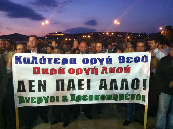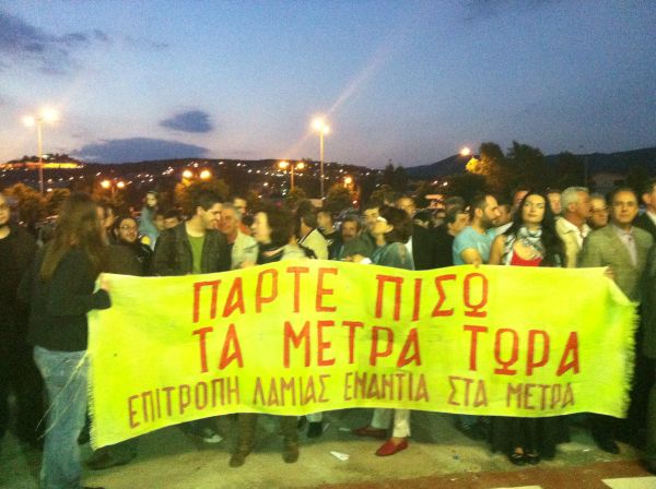 Δίπλα ακριβώς, πολίτες της Επιτροπής Λαμίας Ενάντια στα μέτρα. με σύνθημα:<<ΠΑΡΤΕ ΠΙΣΩ ΤΑ ΜΕΤΡΑ ΤΩΡΑ>>