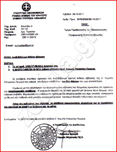 Αποκαλυπτική όμως είναι και η ανάλυση που διενεργήθηκε από το Γενικό Χημείο του Κράτους σχετικά με τις τοξικές ουσίες που λυμαίνονται την περιοχή.
