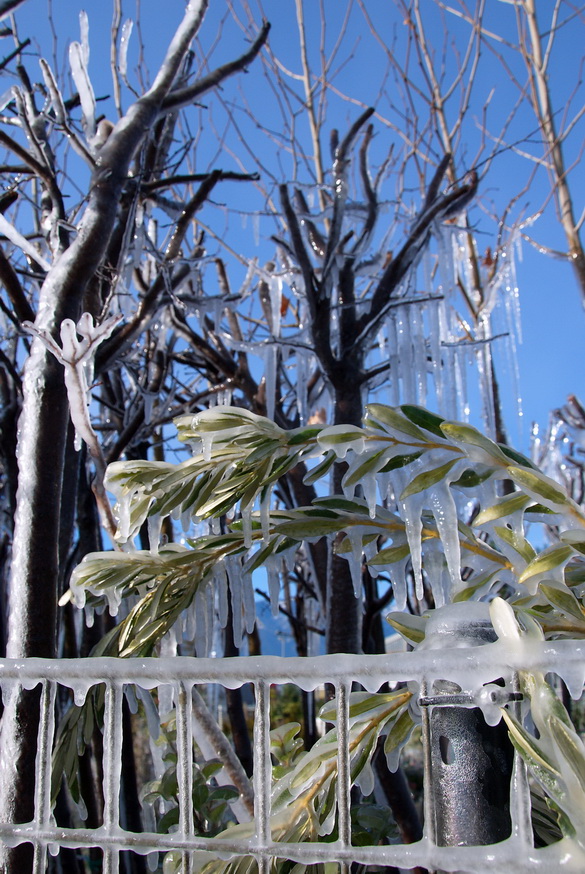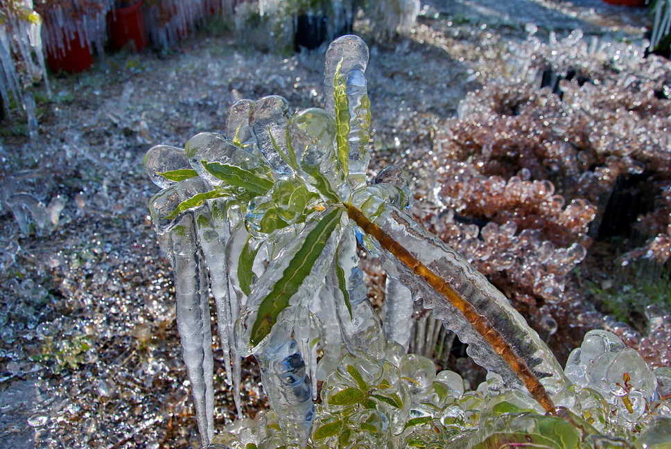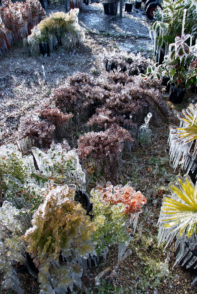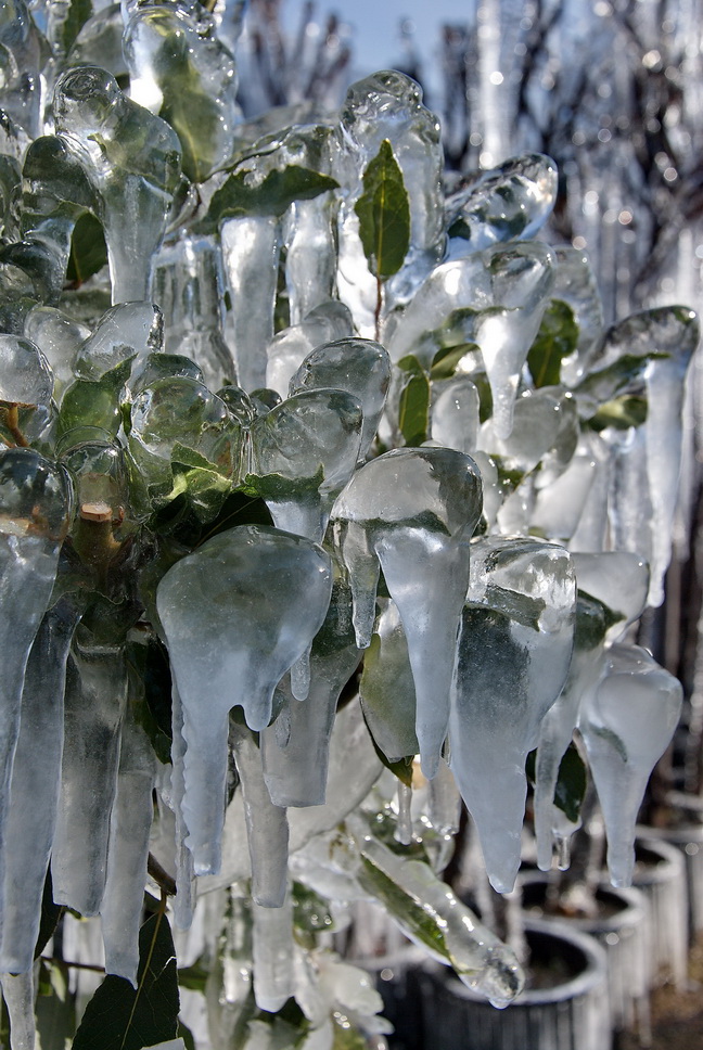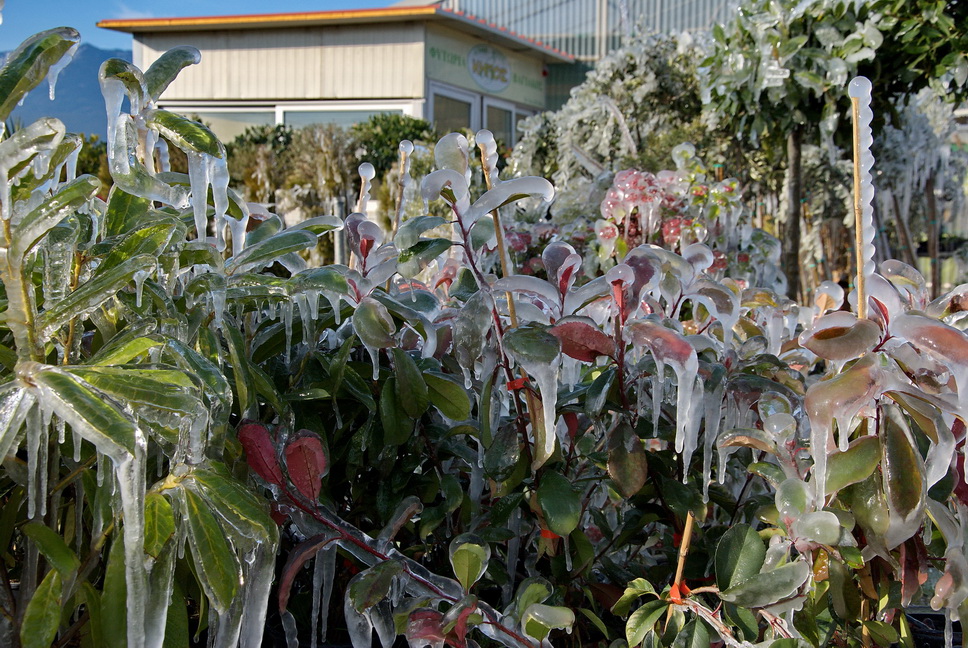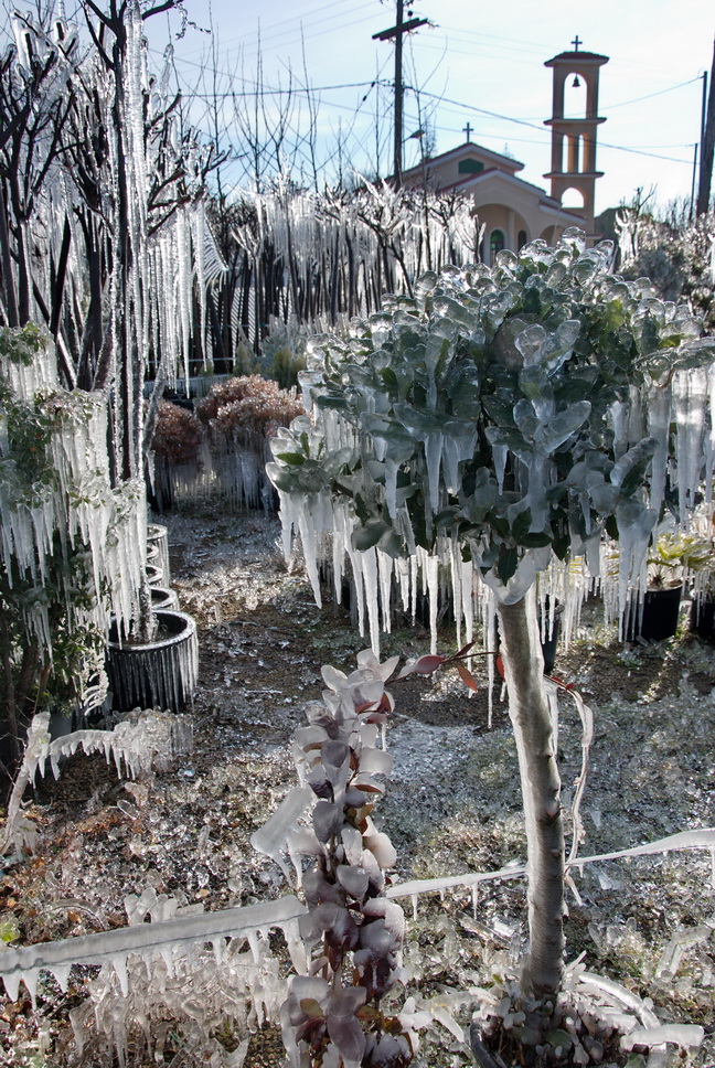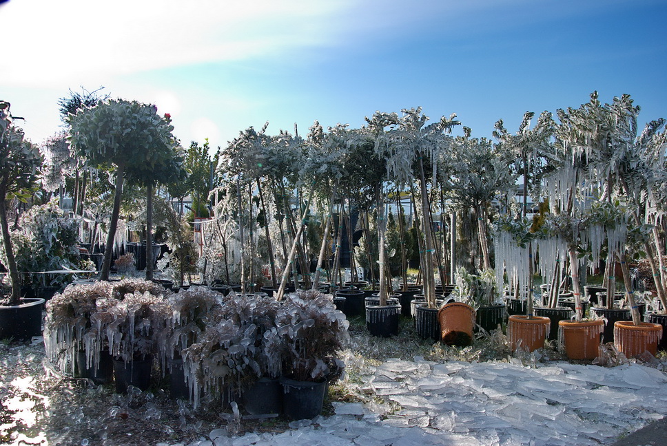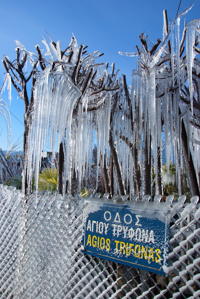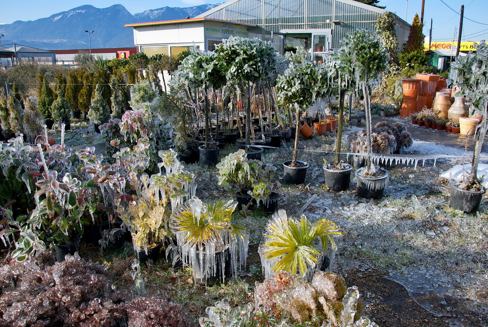 Έτσι στο φυτώριο, που βρίσκεται στην περιοχή της ΠΕΛ, κοντά στον Αγ. Τρύφωνα, το νερό από το αυτόματο πότισμα, πάγωσε και το αποτέλεσμα το βλέπετε στις φωτογραφίες του Δημήτρη Ανάγνου.