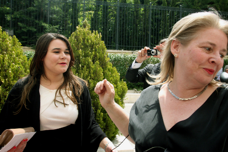 Η Αλέκα Παπαρήγα μόλις έφτασε, είδε στις σκάλες τον αρχηγό της Χρυσής Αυγής, Νίκο Μιχαλολιάκο, έκανε μεταβολή και αντί να ανέβει τις σκάλες πήγε από την πλαϊνή ράμπα και μπήκε στο κτίριο.