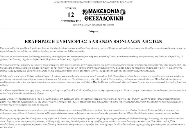 Μια νέα ανατριχιαστική πτυχή για το παρελθόν του αδίστακτου Αλβανού κακοποιού Μάριον Κόλα αναφέρεται σε παλαιότερο δημοσίευμα της Μακεδονίας, καθώς το 1995 όταν ο Κόλα είχε συλληφθεί για σωρεία ληστειών, είχε κατηγορηθεί και για την άγρια δολοφονία ενός ταξιτζή, με του οποίου του αίμα έγραψε στη συνέχεια σε έναν τοίχο «βρωμοελληνες θα σας εκδικηθούμε».Σύμφωνα με φύλλο της εφημερίδας Μακεδόνία το οποίο εκδόθηκε στις 12/11/1995, ο Κόλα σε ηλικία 18 χρονών είχε συλληφθεί μαζί με την τότε συμμορία του πως είχε διαπράξει σωρεία ληστειών, «ρημάζοντας» στην κυριολεξία τα χωριά της Πιερίας.