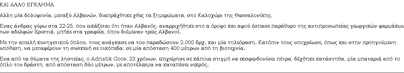 Αλλη μία δολοφονία, μεταξύ Αλβανών, διαπράχθηκε χθες τα ξημερώματα, στο Καλοχώρι της Θεσσαλονίκης.
