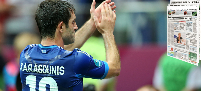 Gazzetta dello Sport (Ιταλία): «Αυτήν τη φορά ο Καραγκούνης πρόδωσε την Ελλάδα. Η Πολωνία σώθηκε με ισοπαλία. Η πρεμιέρα του Euro 2012 ολοκληρώθηκε με 1-1. Ο Σαλπιγγίδης απάντησε στο Λεβαντόφσκι και μετά ο πρώην παίκτης της Ίντερ, ο οποίος το 2004 σκόραρε στην πρεμιέρα της Πορτογαλίας, αστόχησε από τη βούλα. Αποβλήθηκαν οι Παπασταθόπουλος και Στσέσνι».